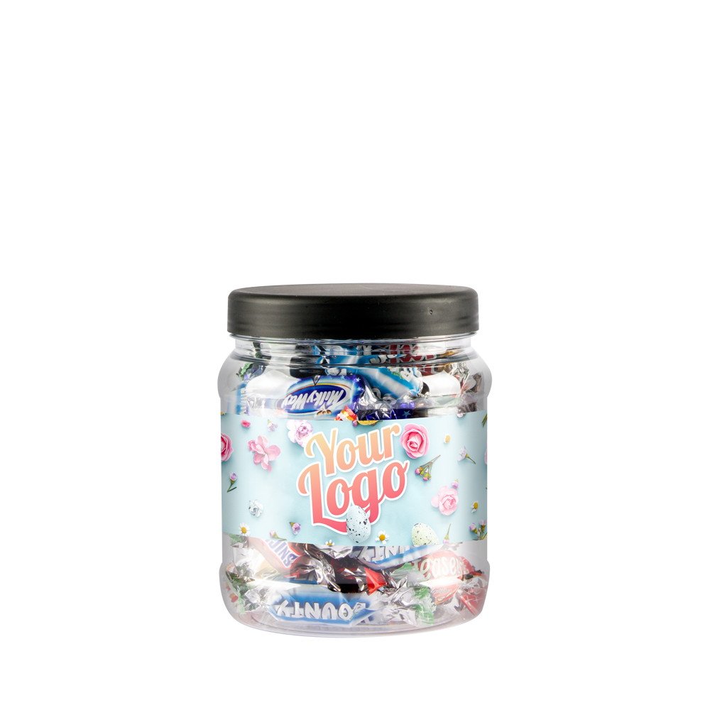 De velkendte Celebration chokolader, pakket i transparent 1000 ml bøtte og sort plast låg. Dit design på etiketten som måler 204 x 62 mm